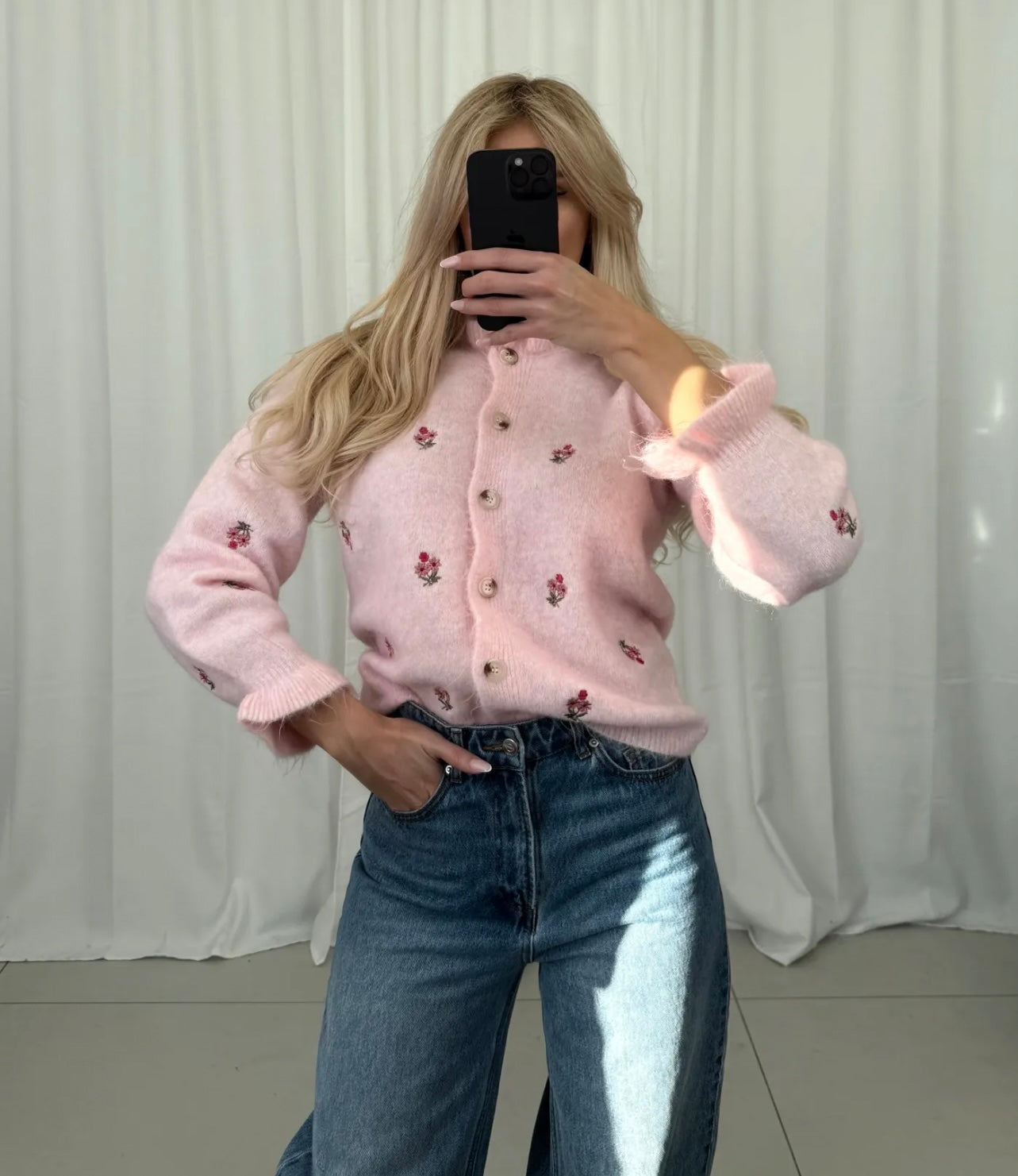 Het fijne breisel voelt heerlijk comfortabel aan en is afgewerkt met subtiele, geborduurde bloemetjes voor een romantische en vrouwelijke uitstraling.